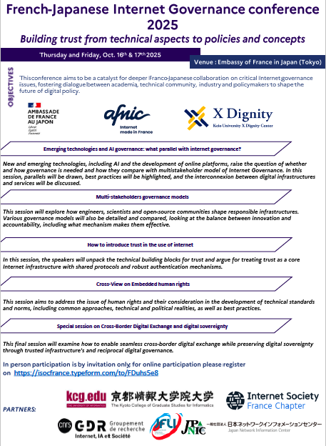 Cette conférence vise à être un catalyseur pour une collaboration franco-japonaise plus approfondie sur les questions cruciales de gouvernance de l’Internet, en favorisant le dialogue entre le monde universitaire, la communauté technique, l’industrie et les décideurs politiques pour façonner l’avenir de la politique numérique.